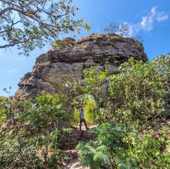 A trilha é de 16km (ida e volta), dificuldade moderada para difícil, requer um preparo físico para alcançar o ponto mais alto do Parque Nacional de Chapada dos Guimarães. Por todo o caminho somos circundados por sugestivas formações rochosas que lembram navios, totens e animais. Após 5 quilômetros de caminhada e uma pequena subida, atravessamos por um corredor na rocha que descortinará a vista para o Morro de São Jerônimo, o “testemunho”, último sobrevivente com tal altura. Depois de atravessar uma pequena floresta, estaremos no pé do Morro e iniciaremos a subida. A partir daí o desafio aumenta tendo pequenas escaladas durante o paredão tendo que usar várias vezes as mãos para se equilibrar e se erguer (importante ter mãos livres sempre).